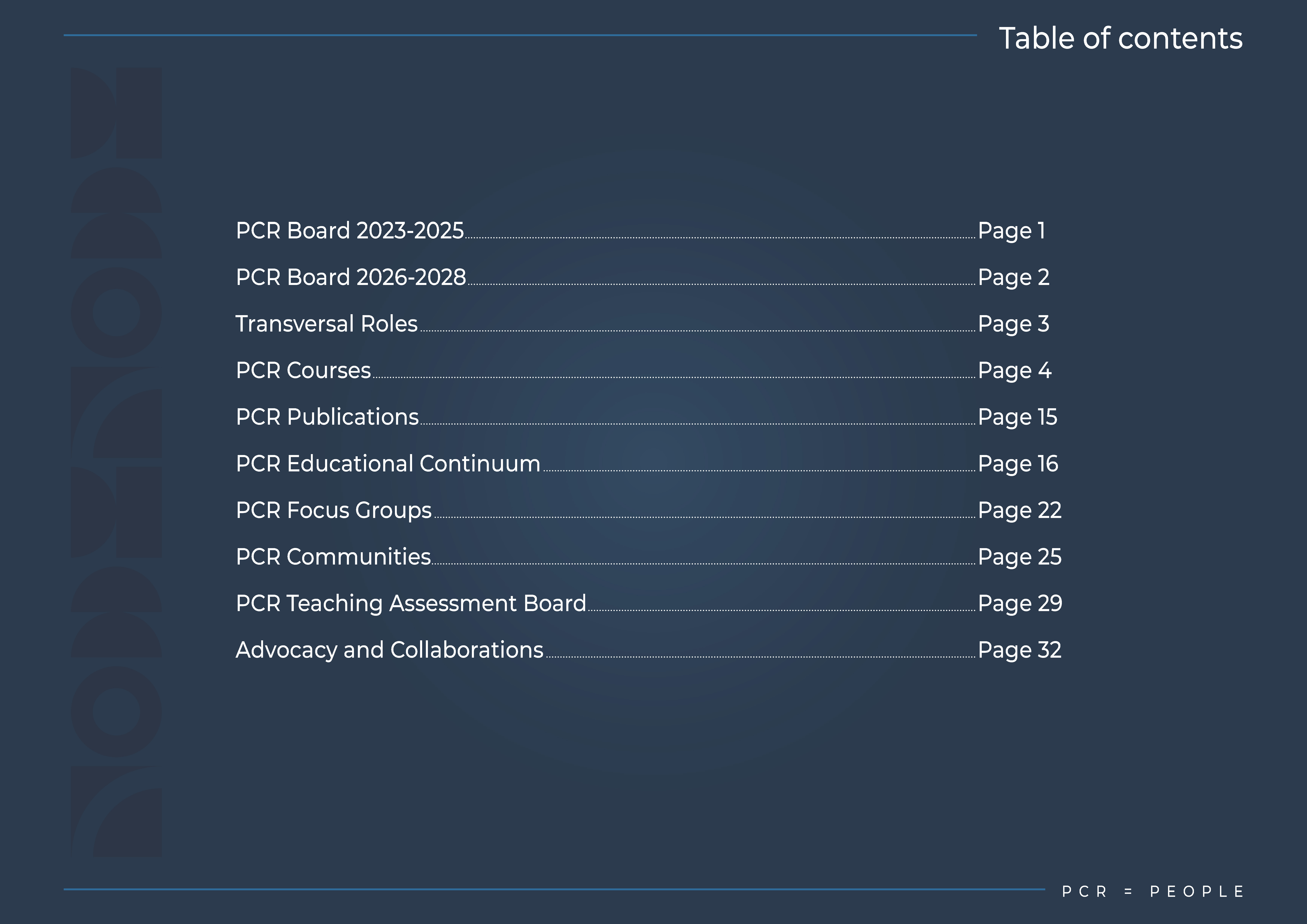 In the “PCR = People" booklet you will find the names and faces of colleagues who fulfil key roles across the multitude of PCR initiatives. There are so many more people, too numerous to mention in this document, whose expertise and time also contribute to the success of PCR activities - we are endlessly grateful to them all.