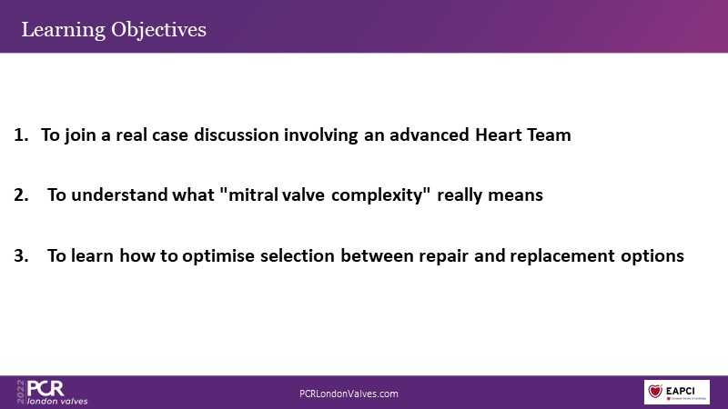 Join an advanced Heart Team in a real case discussion to understand what "mitral valve complexity" really means and to learn how to optimise selection between repair and replacement options.