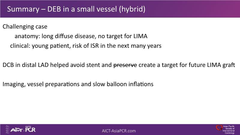 Consult this session if you want to learn the tips and tricks to perform a small vessel disease intervention and to discuss the pros and cons of treating small vessel disease with DCB and/or DES.