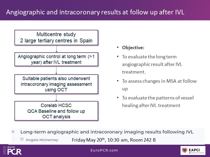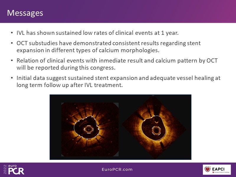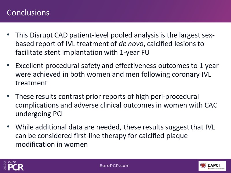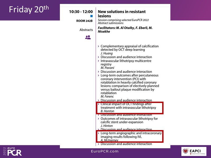 This EuroPCR 2022 session mainly focuses on the DISRUPT CAD studies: hear discussion on the latest DISRUPT CAD clinical evidence supporting the use of IVL across different calcium morphologies, appraise the most recent one-year OCT-pooled analysis of the DISRUPT CAD III and IV studies, and learn about the differences in female PCI outcomes with IVL versus Rota.