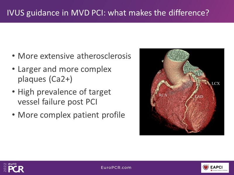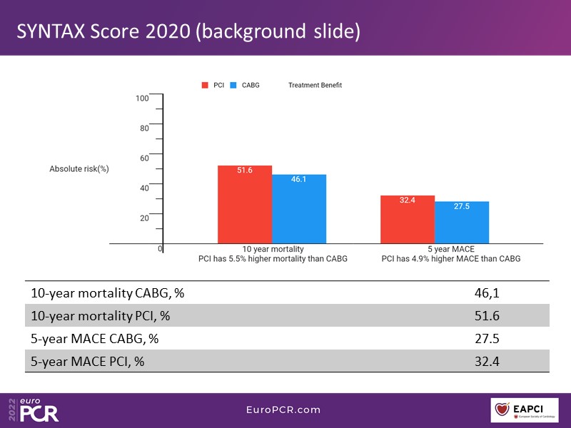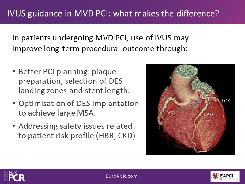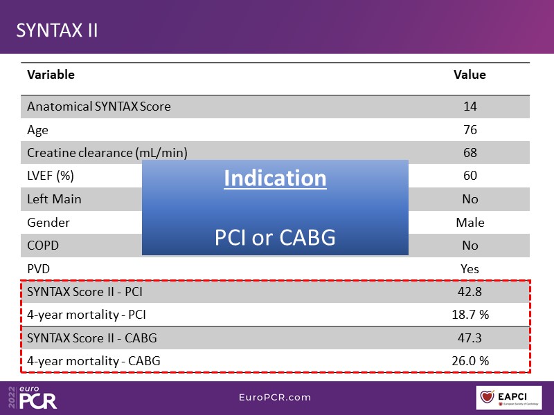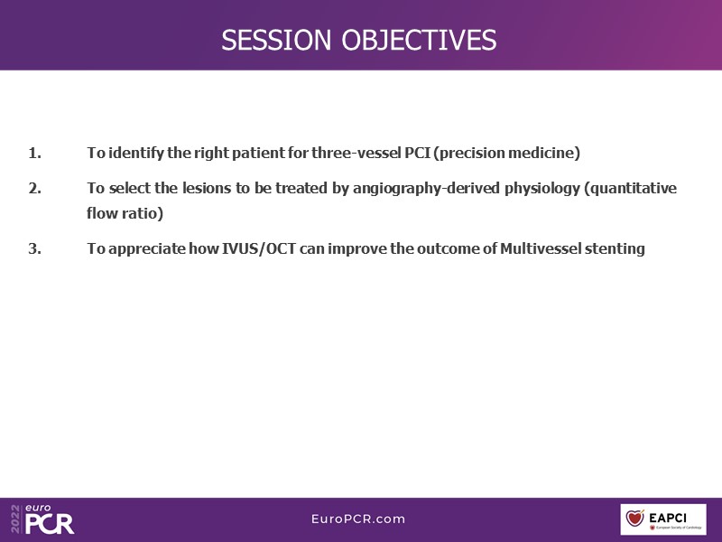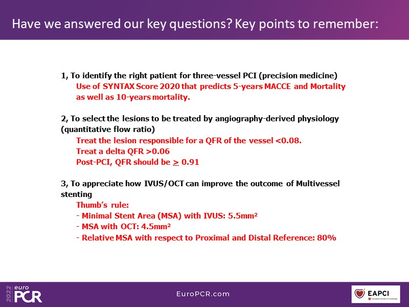 What is angiographic SYNTAX score? Are 3VD all the same? What do ESC guidelines recommend? You will find answers to these questions, and many more, in this EuroPCR 2022 session, through which you will learn how to identify the right patient for three-vessel PCI, select the lesions to be treated by angiography-derived physiology, and appreciate how IVUS/OCT can improve the outcome of multivessel stenting.