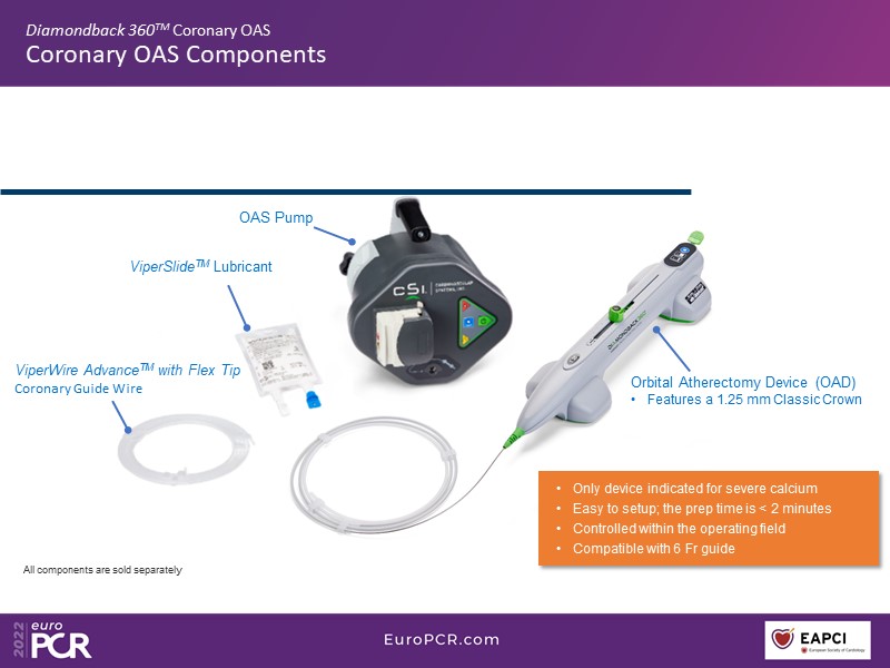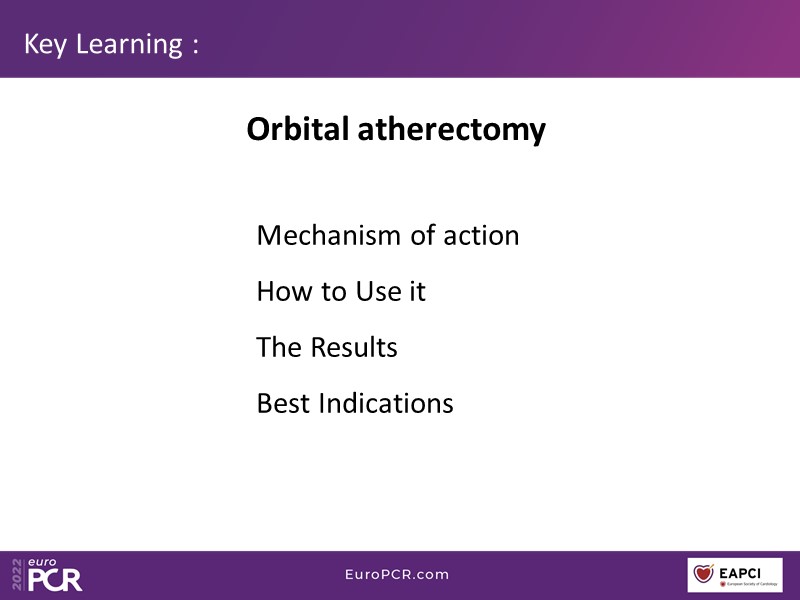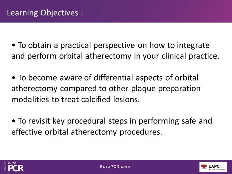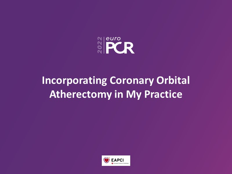 This EuroPCR 2022 session aims to examine the improvement of technology in the treatment of highly calcified coronary lesions: get a practical perspective on how to integrate and perform orbital atherectomy in your clinical practice, become aware of its differential aspects compared to other plaque preparation modalities to treat calcified lesions, and review the key procedural steps to achieve safe and effective procedures.