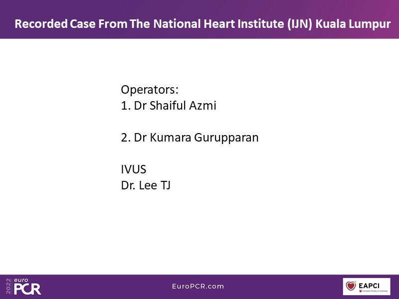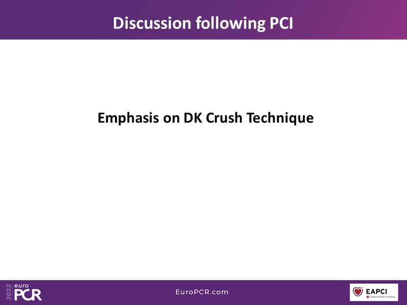 In this EuroPCR 2022 session, follow the discussion around the recorded case of a 67-year-old non-smoking male patient who presented with chest pain on exertion typical of angina for one month, and learn how to optimally treat a severely calcified long lesion, understand how imaging can help in strategizing the PCI procedure in a calcified vessel, find out how to perform bifurcation PCI of left main and LAD/D1 with two-stent technique, and remember the important factors to be taken into consideration when choosing a left main stent.