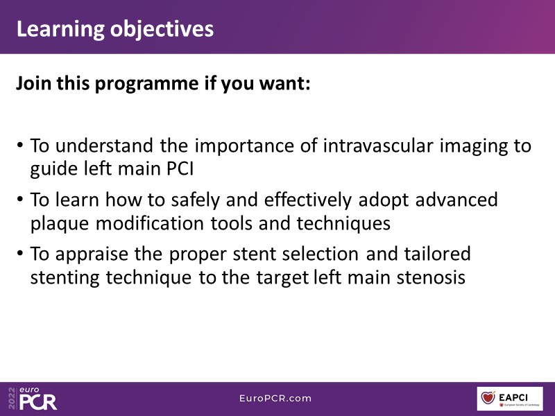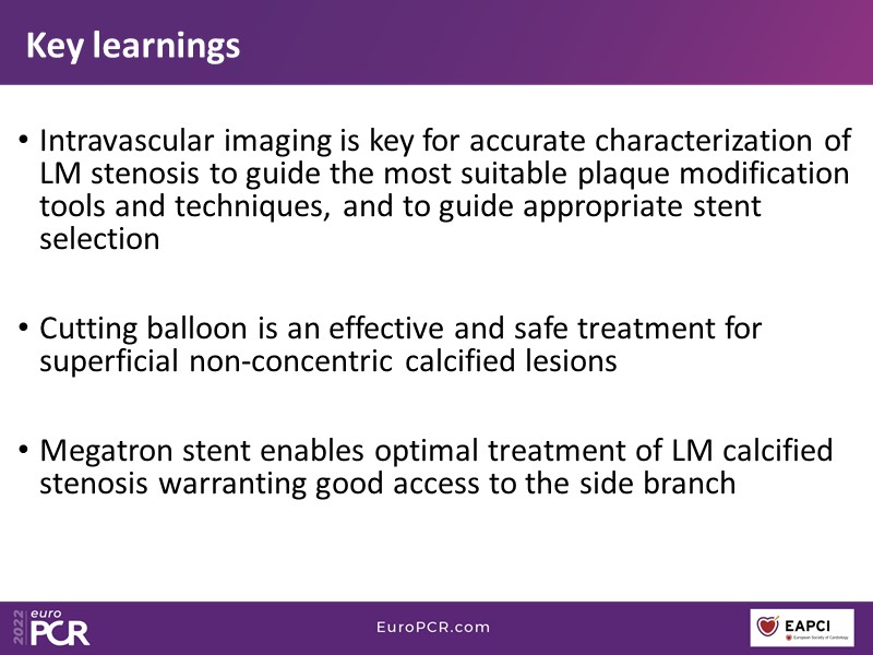 Consult this session to find out about the importance of intravascular imaging to guide left main PCI, to learn how to safely and effectively adopt advanced plaque modification tools and techniques, as well as to appraise the proper stent selection and tailored stenting technique to the target left main stenosis.