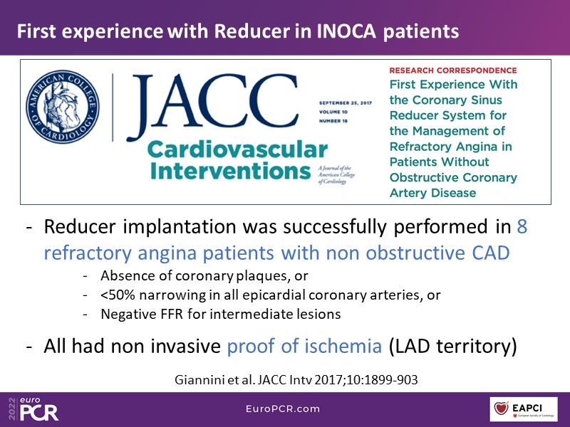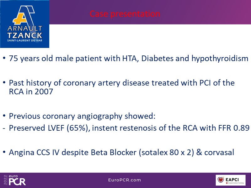 Looking at a 75-year-old male patient with HTA, diabetes, and hypothyroidism, a history of coronary artery disease treated with PCI of the RCA, and a previous coronary angiography showing preserved LVEF and in-stent restenosis of the RCA, you will learn in this EuroPCR 2022 session how to get started with the Reducer in your lab, get tips and tricks for implantation and understand how the therapy works.