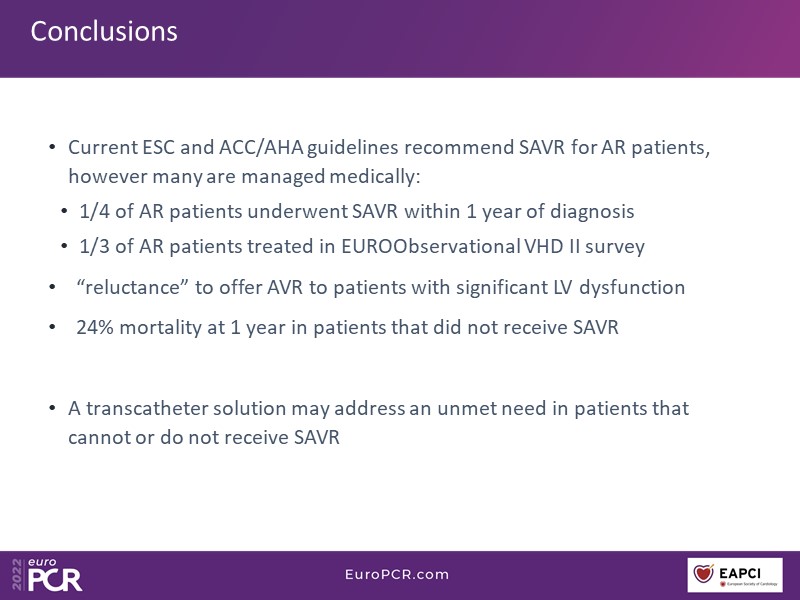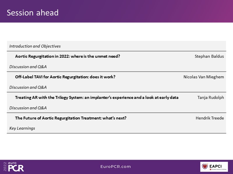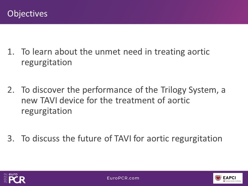 Watch this EuroPCR 2022 session to learn all about the unmet need in treating AR, to discover the performance of the Trilogy System (a new TAVI device for the treatment of AR), as well as to explore the future of TAVI for AR.