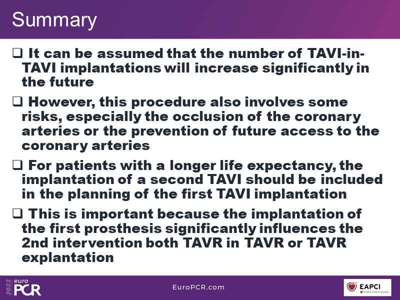 In this EuroPCR 2022 session featuring Philip Maccarthy, Julia Mascherbauer, Hendrik Treede, Christian Hengstenberg, Radoslaw Parma, and Giuseppe Tarantini, analyze the impact of valve-in-valve interventions on lifetime management, learn about particular clinical considerations and the procedural technique of TAVI-in-TAVI procedures, and appreciate the potential pitfalls of such procedures and how to mitigate them.