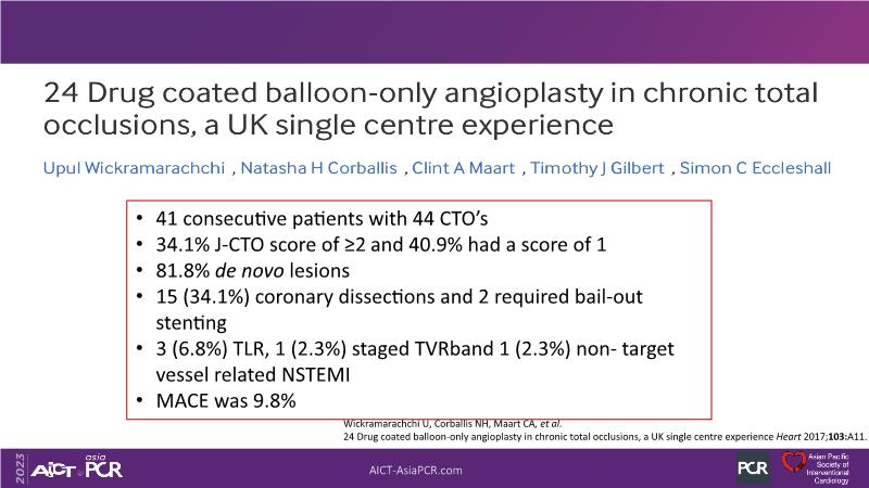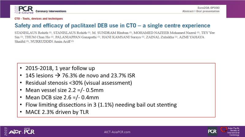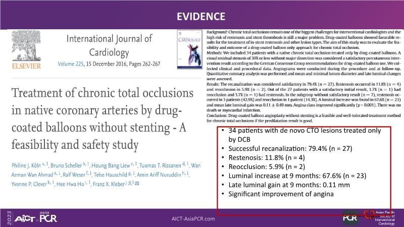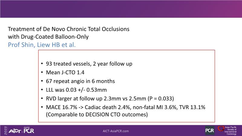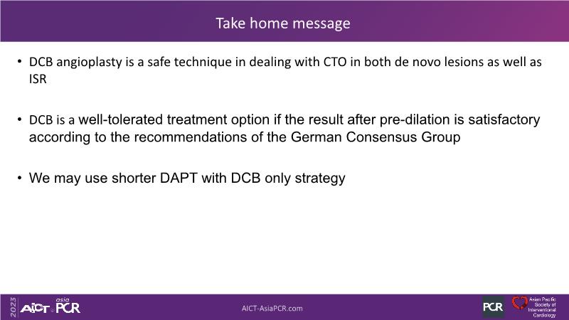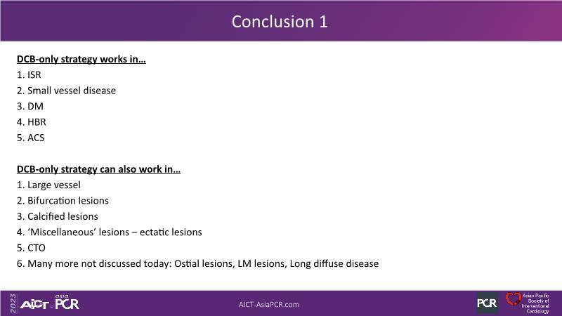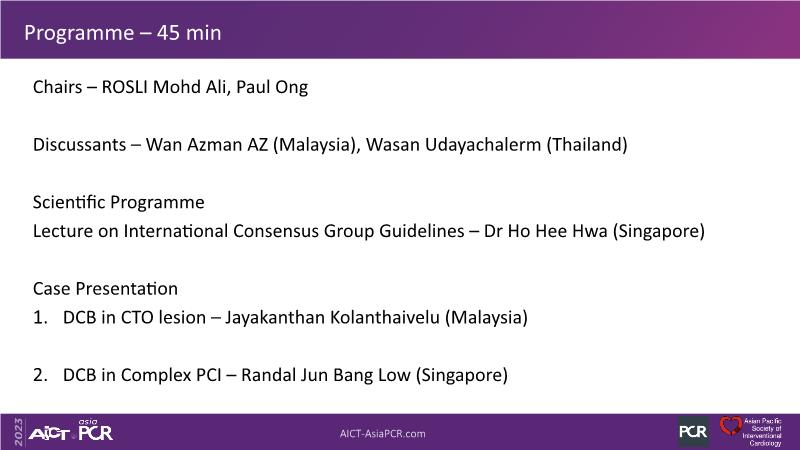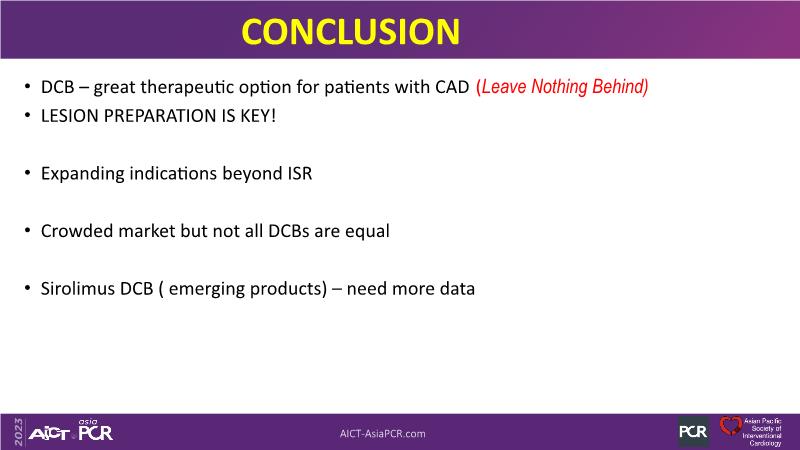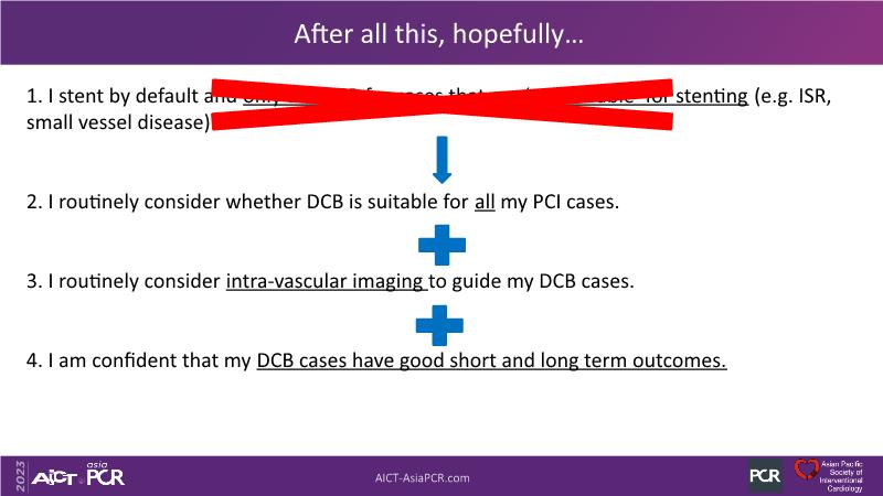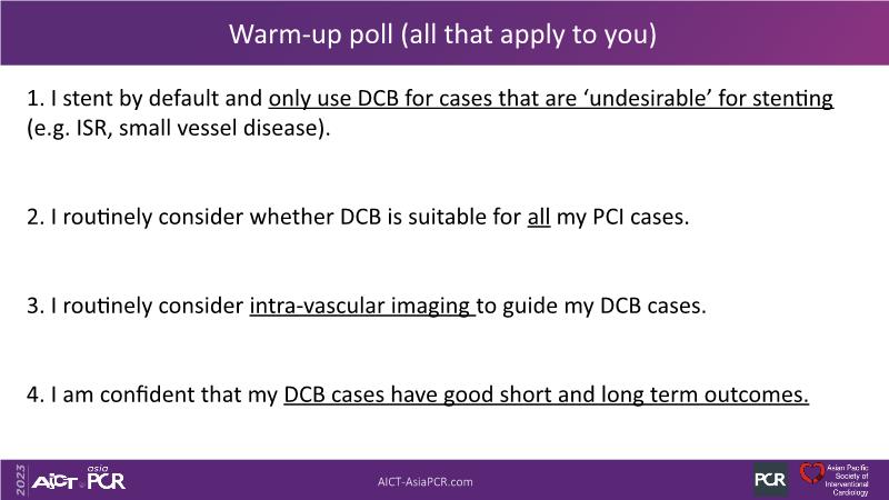 This session offers an opportunity to stay informed about the recent developments in the International DCB Consensus Group, gain insights into the latest clinical data and real-world experiences related to drug-coated balloon (DCB)-only PCI, understand the safety aspects of DCB in managing complex PCI cases, and participate in an interactive discussion with experts.
