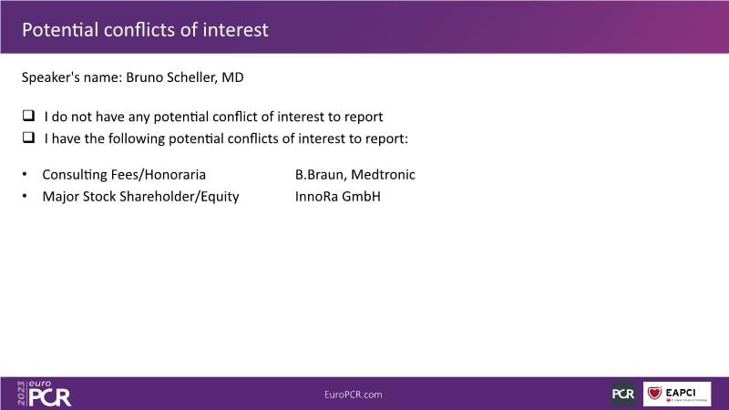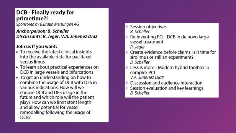 - To get an understanding on how to combine the usage of DCB with DES in various indications. How will we choose DCB and DES usage in the future and which role will the patient play? How can we limit stent length and allow potential for vessel remodelling following the usage of DCB?