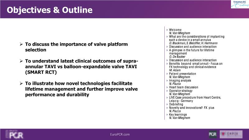 - To become aware of the latest clinical outcomes of supra-annular TAVI vs balloon-expandable valve TAVI, and its impact in practice (SMART data)