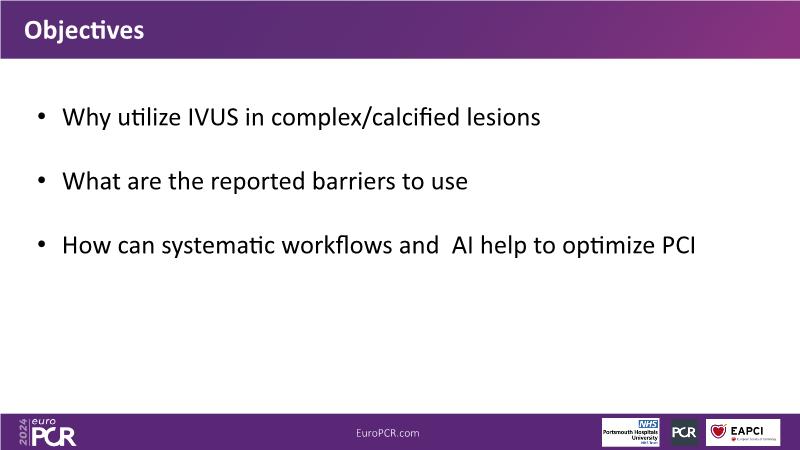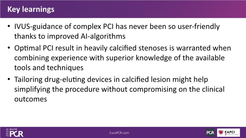 In this session, observe the enhanced user-friendliness of IVUS-guided complex PCI with improved AI algorithms, recognize the importance of combining experience with advanced knowledge of tools and techniques for optimal PCI outcomes in heavily calcified stenoses, and understand how tailoring drug-eluting devices for calcified lesions can streamline procedures without compromising clinical efficacy.