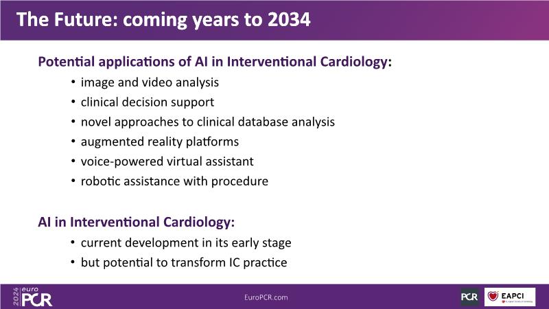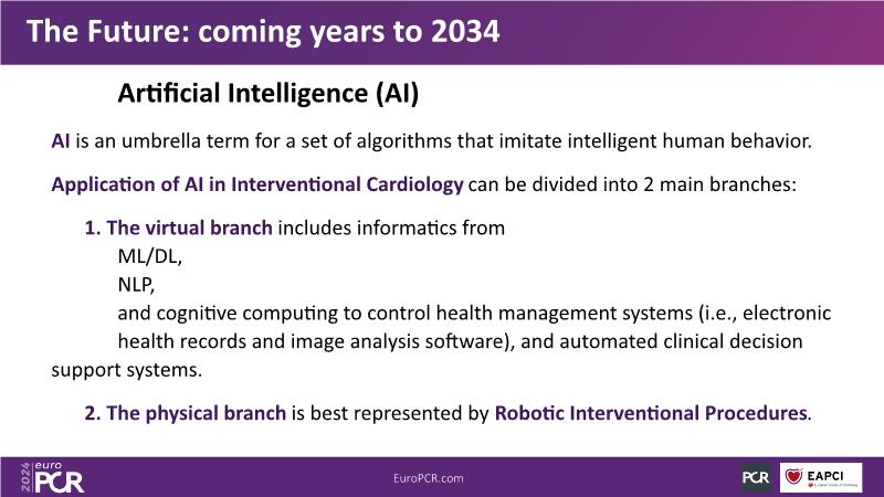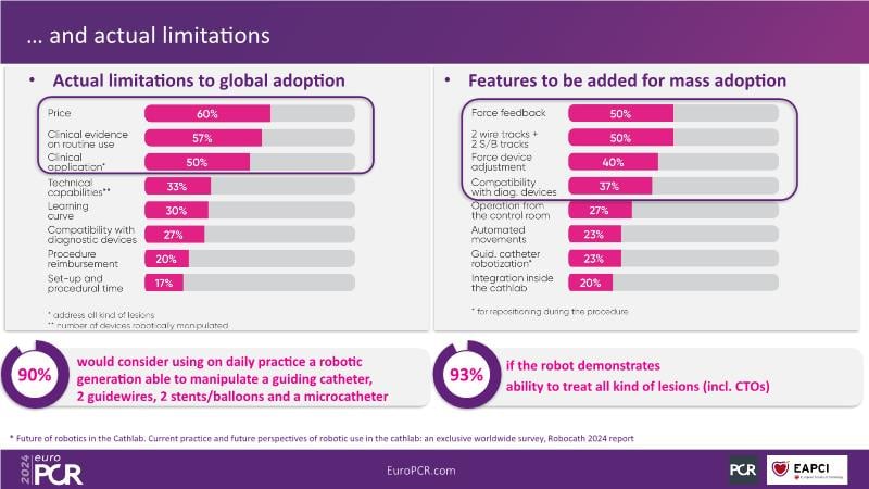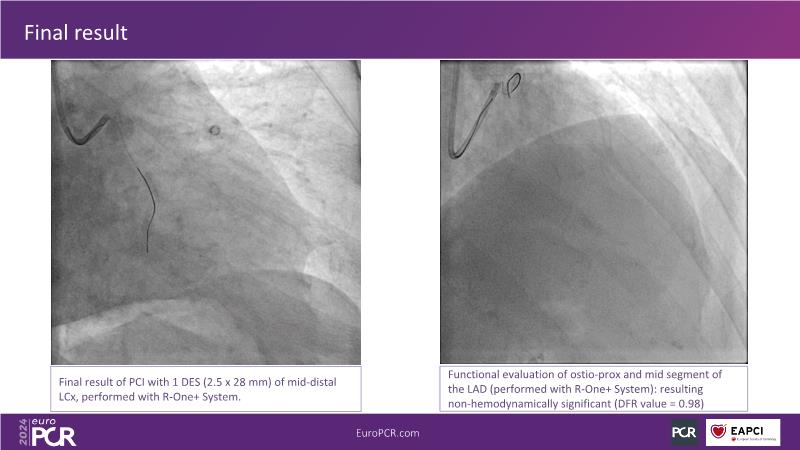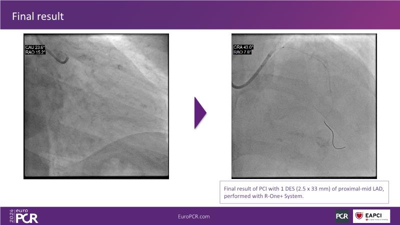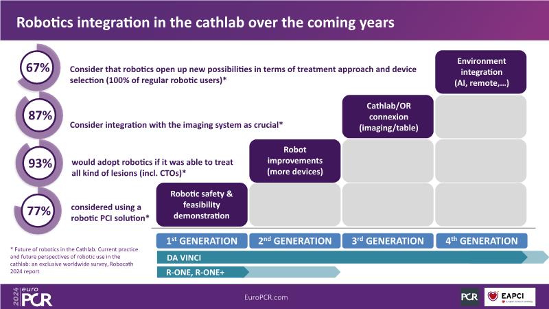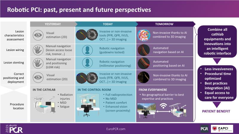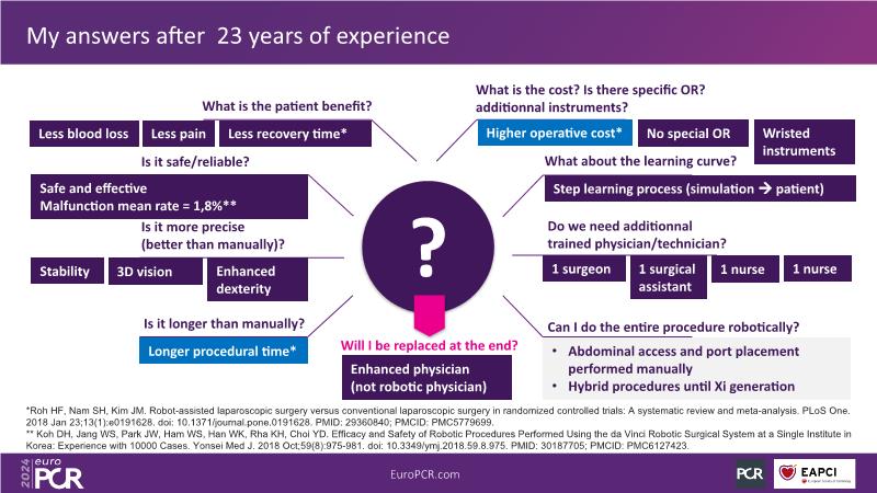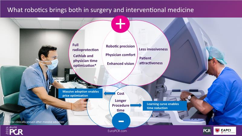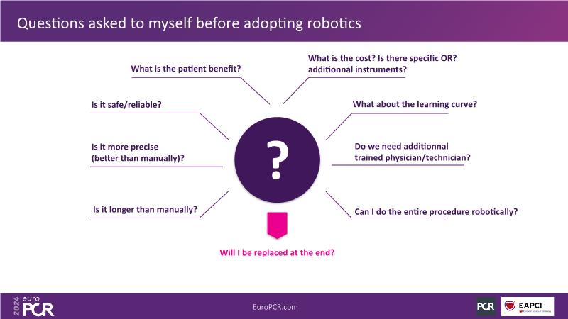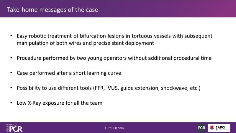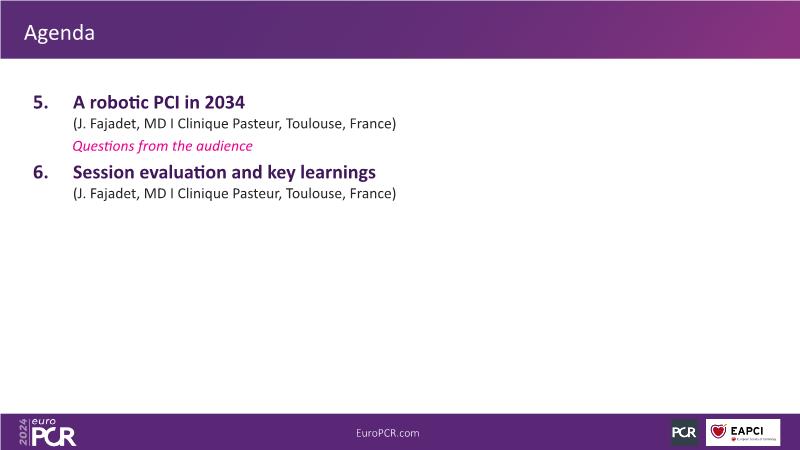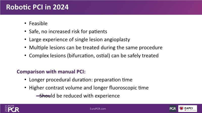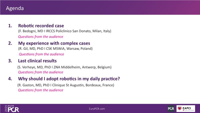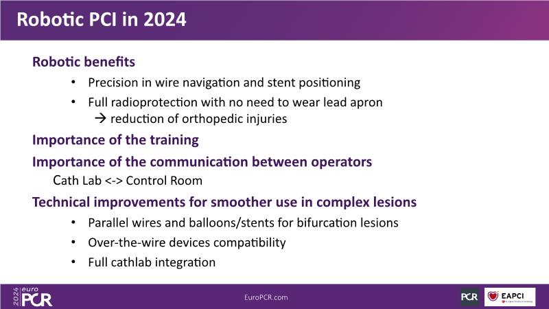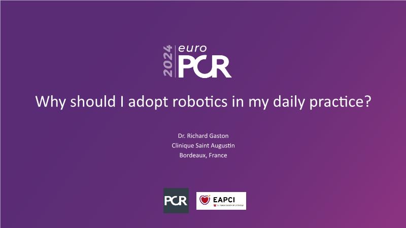 In this session, discover the effectiveness and safety of robotic PCI for both simple and complex lesions requiring additional devices like IVL, IVUS, laser, and FFR. Learn about the numerous benefits of robotics for patients and cathlab teams, including enhanced precision in wire navigation and stent positioning, full radioprotection, and reduced orthopedic injuries. Explore the growing interest in robotics within the interventional cardiology community, anticipate future technical advancements, and understand how AI will accelerate the integration of robotics and vice versa.