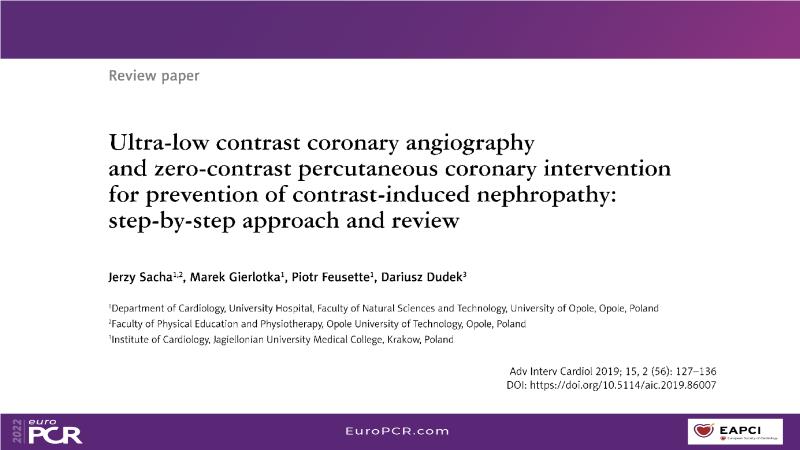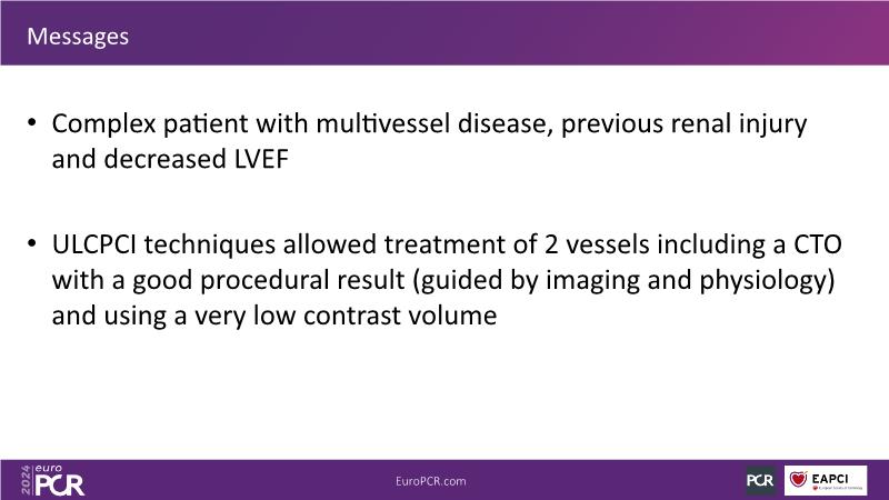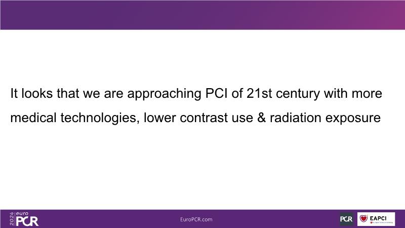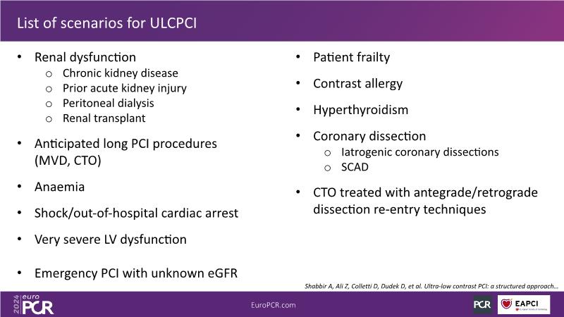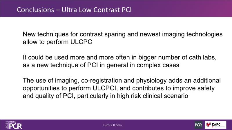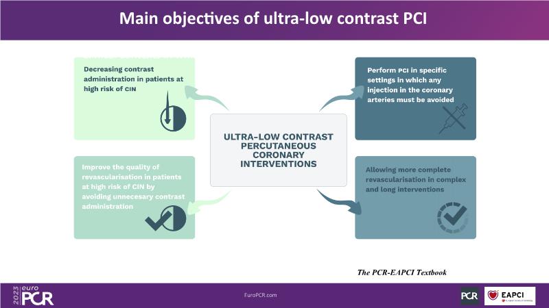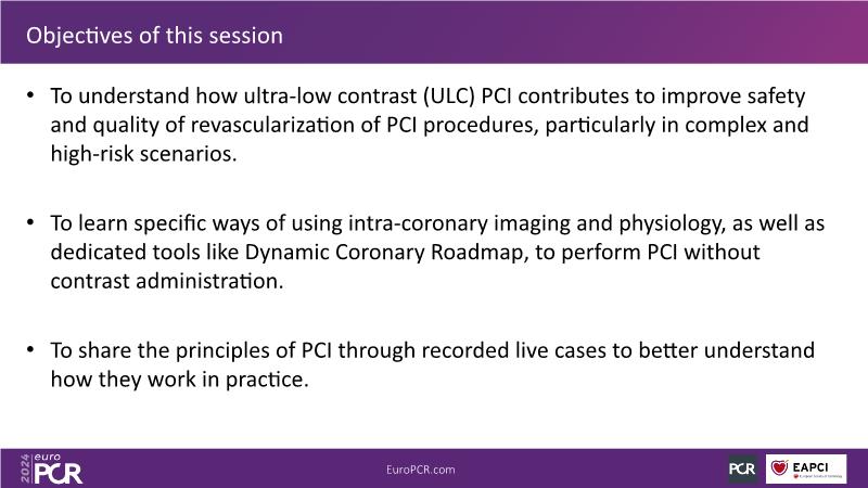 - To understand how ultra-low contrast (ULC) PCI contributes to improve safety and quality of revascularisation of PCI procedures, particularly in complex and high-risk scenarios