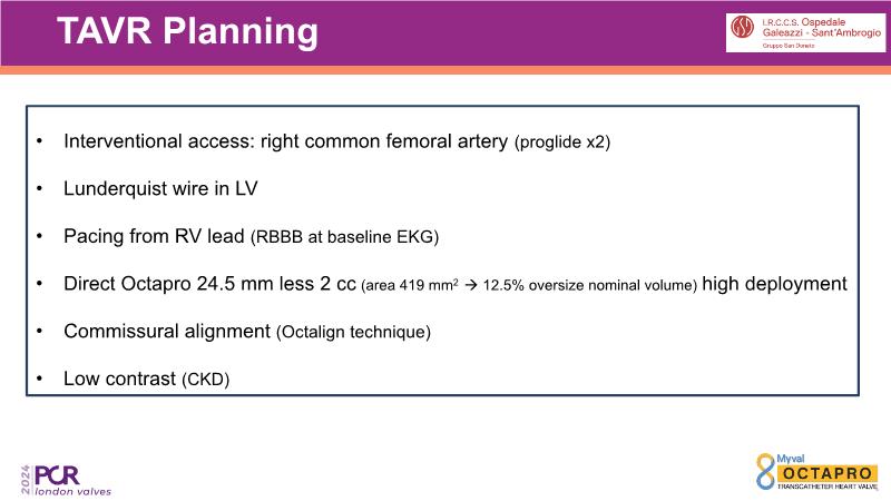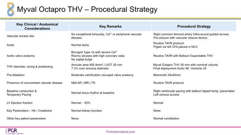 Through the presentation of several compelling cases, including an 88-year-old male with CKD, RBBB, moderate LV dysfunction, and severe aortic stenosis, a Type 1a bicuspid native AS, and an extraordinary TAVI in an 83-year-old with acute heart failure and comorbidities, this session will dive into the Myval Octapro THV. Learn about its key features, procedural impact, and potential clinical benefits. Discover the Octalign technique for predictable and precise commissural and coronary alignment, preserving coronary access. Gain insights into precise sizing, positioning, and deployment of the Myval THV series in real-world scenarios, and explore the relevance of pivotal Landmark RCTs in clinical practice.