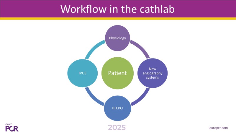This session examines evolving catheterisation lab workflows, highlighting how integrated imaging, physiology, and procedural strategies are reshaping PCI practices. Speakers emphasize the importance of advanced pre-procedural planning using modalities such as intravascular ultrasound (IVUS) to optimise stent deployment, and cardiac computed tomography angiography (CCTA) to improve diagnosis and minimize contrast-induced nephropathy. Illustrated by real-life clinical cases, the session demonstrates how combining imaging and physiology with angiography improves workflow efficiency, enhances procedural quality, and reduces both radiation exposure and contrast volume. The session concludes with a call to adopt this integrated, technology-enabled PCI approach to better address the growing complexity of interventional cardiology cases.