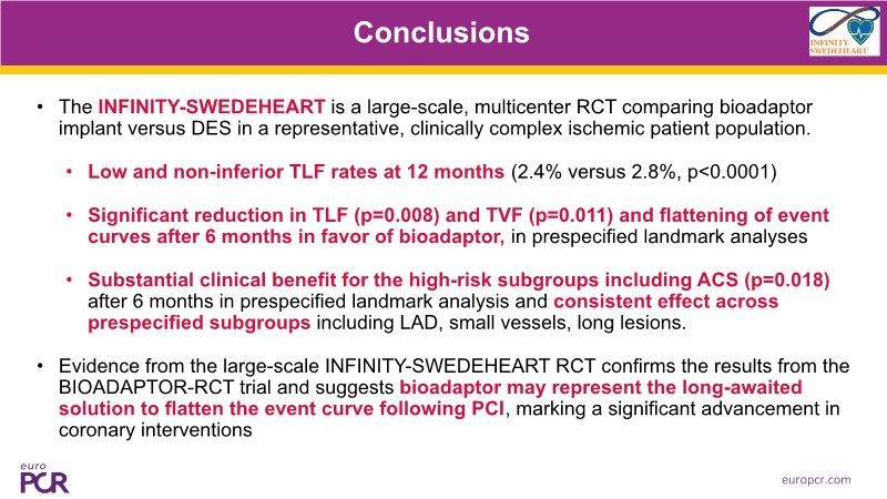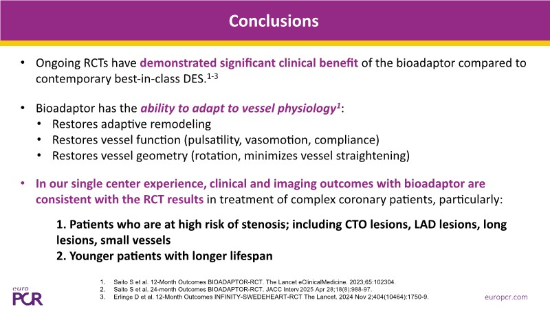 This session provides an in-depth overview of Bioadapter technology and its potential to overcome the limitations of current drug-eluting stents (DES) in percutaneous coronary intervention (PCI). Speakers present data from recent trials, including the Bioadapter RCT and the Infinity Sweetheart study, demonstrating a reduction in target lesion failure and other cardiovascular events, particularly in complex and high-risk coronary anatomies such as chronic total occlusions, long lesions, LAD lesions, and small vessels. The session also features real-world clinical experience, practical implantation strategies, and highlights the unique properties of Bioadapter stents—namely their capacity to adapt to vessel physiology and promote adaptive remodeling. Future directions for research into long-term outcomes and mechanisms of action are also discussed, positioning Bioadapters as a promising advance in interventional cardiology.