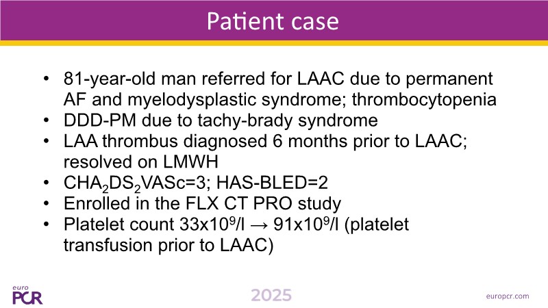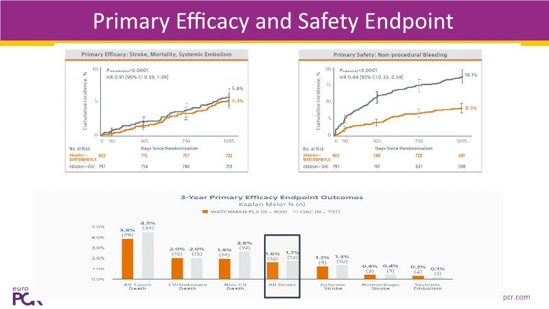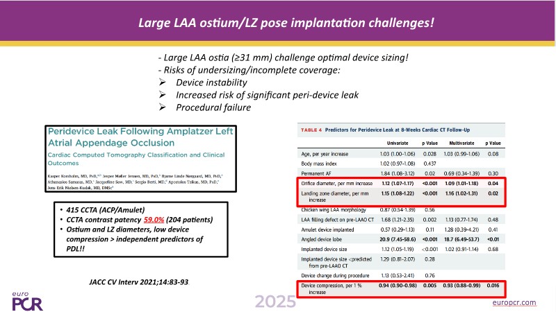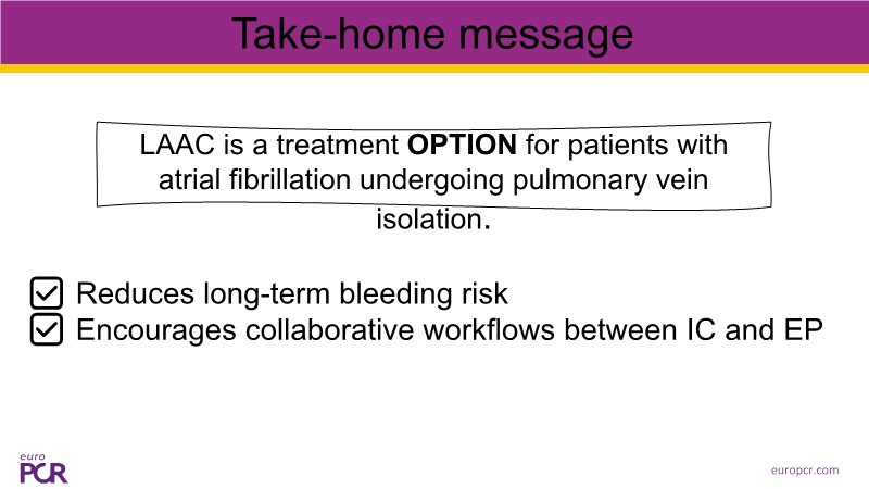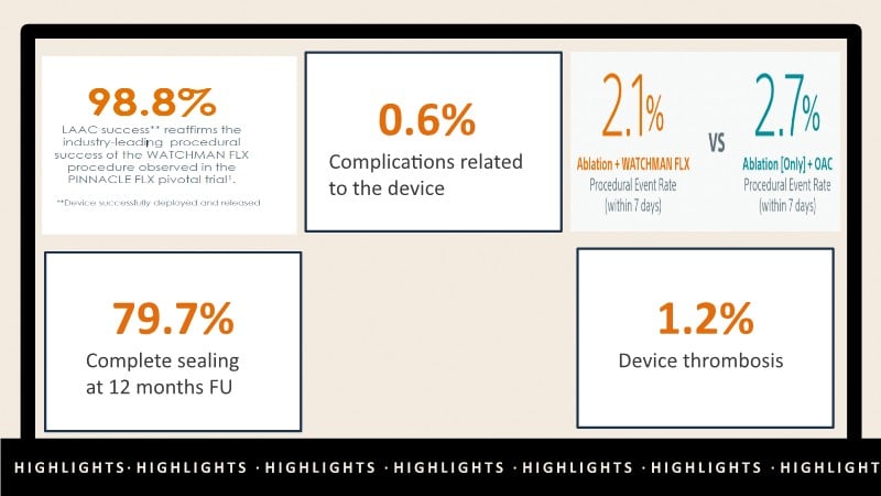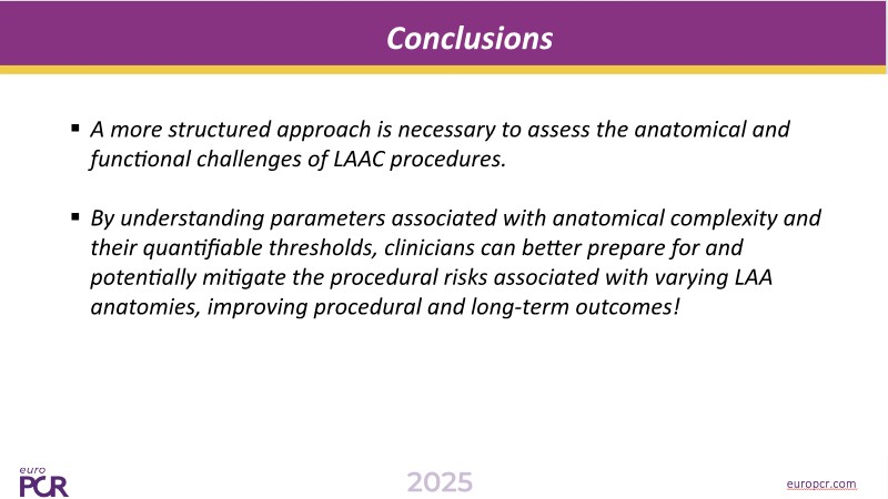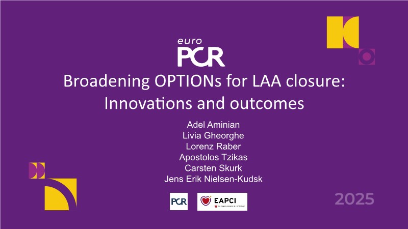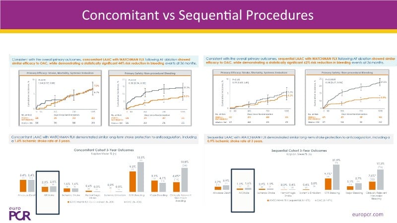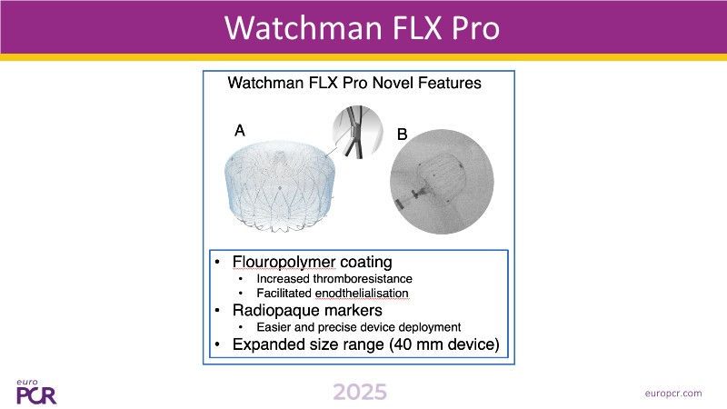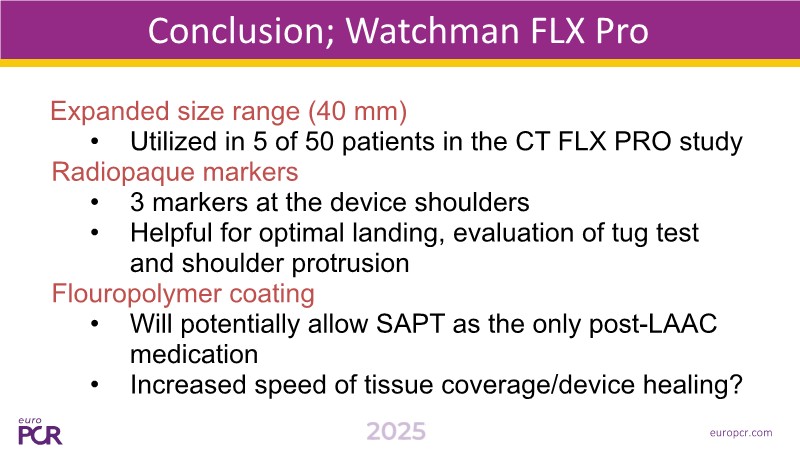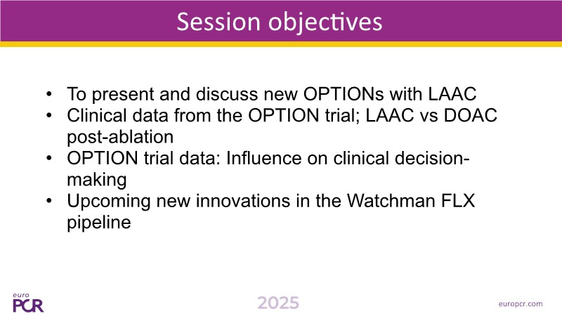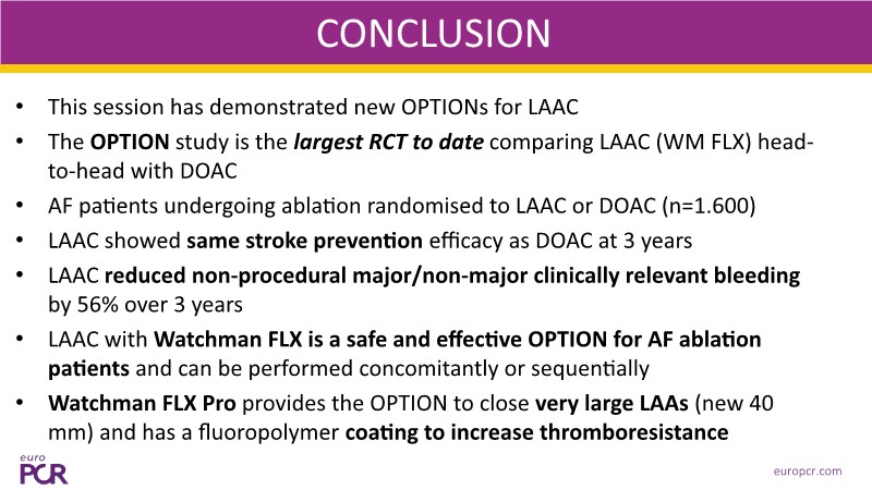 Explore the latest insights into LAA closure from EuroPCR 2025. This session highlights results from the OPTION trial—the largest RCT comparing LAAC (with Watchman FLX) to DOAC therapy in AF patients undergoing ablation. The findings? Comparable stroke prevention at 3 years, with a 56 % reduction in non-procedural bleeding. You'll also hear how LAAC with Watchman FLX offers flexibility in timing—whether performed during or after ablation—and discover the expanded capabilities of the Watchman FLX Pro, now suited for very large LAAs thanks to its new 40 mm size and thromboresistant coating.