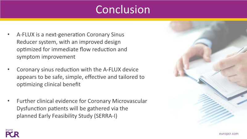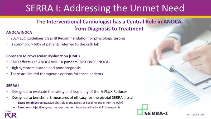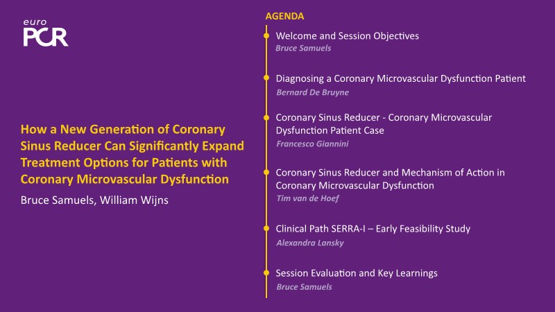 Discover the latest on managing coronary microvascular dysfunction (CMD) with insights from EuroPCR 2025. This session explores how physiology testing helps identify CMD endotypes in the cathlab and highlights the limitations of ETT for patients experiencing angina or dyspnea at rest. Learn about the A-FLUX coronary sinus reducer: a newly designed device optimised for ease of use and symptom relief. With a mechanism of action based on reducing microvascular resistance, this therapy is emerging as a safe, simple, and effective option. The upcoming SERRA-I feasibility study will further strengthen the clinical evidence for CMD patients with persistent angina or angina-like symptoms.