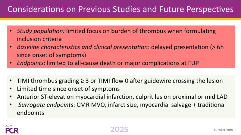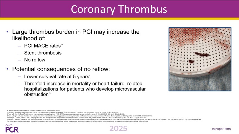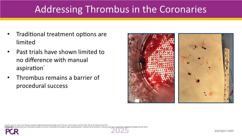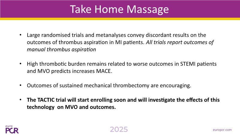 Unlock cutting-edge strategies for thrombus removal in acute coronary syndrome (ACS) with this EuroPCR 2025 session. Understand the mechanisms behind microvascular obstruction and no-reflow phenomena, and why effective thrombus management is crucial. Review the latest clinical evidence, from the Cheetah study to the ongoing TACTIC randomised trial, addressing gaps in current knowledge. Discover practical approaches to treating thrombus burden in complex settings such as proximal lesions and coronary artery ectasia. Through case presentations, learn how vacuum aspiration thrombectomy can simplify complex procedures and improve outcomes in ACS patients.
