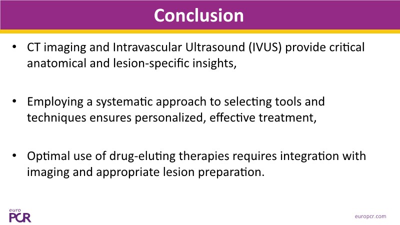 This EuroPCR 2025 session highlights how imaging can drive precision in modern PCI. From CT-guided planning to IVUS-guided drug-eluting balloon interventions, each presentation offers practical insights into optimising patient outcomes. Step-by-step approaches and recorded cases illustrate how to tailor tool and technique selection, while also addressing how to best integrate imaging into the use of drug-eluting therapies.