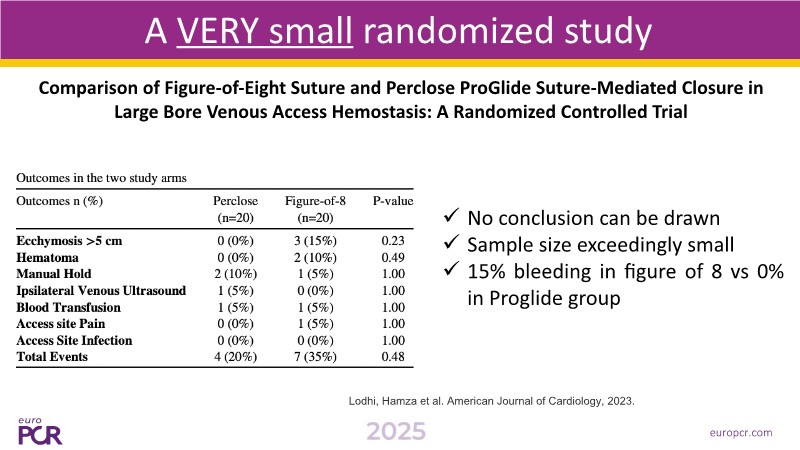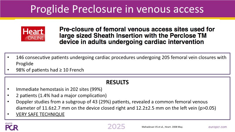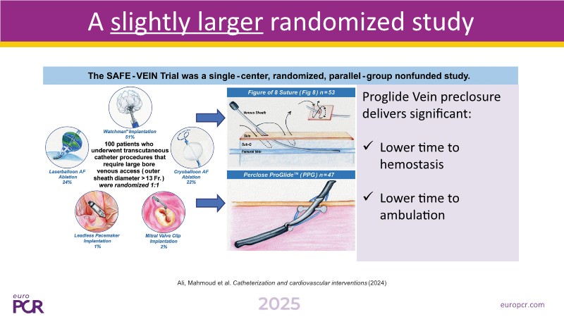Venous closure strategies differ due to anatomy, but through different studies including the SAFE-VEIN trial, ProGlide is shown to offer safer and faster outcomes than traditional sutures, with lower time to hemostasis and ambulation.