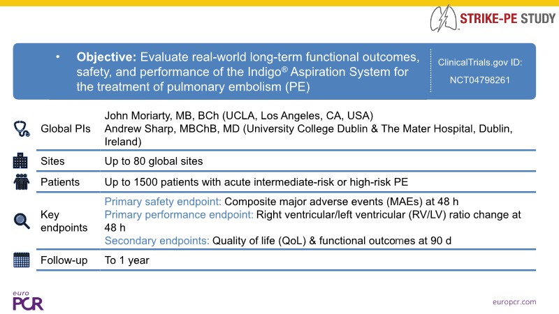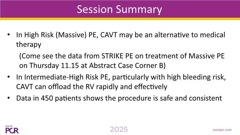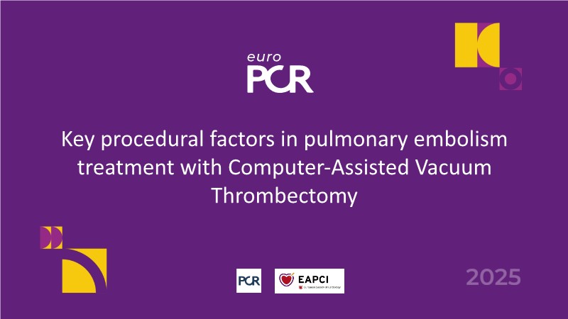 Watch this EuroPCR 2025 session on pulmonary embolism to explore the role of computer-assisted vacuum thrombectomy (CAVT) as an alternative to medical treatment in high-risk (massive) PE, supported by insights from the STRIKE PE study. Discover how CAVT rapidly and effectively offloads the right ventricle in intermediate-high-risk PE patients, especially those with a high bleeding risk. Review safety and efficacy data from a cohort of 450 patients demonstrating consistent procedural success. In short, this video provides a clear understanding of key procedural considerations, the latest evidence on Penumbra technology, and how ongoing innovation is shaping the future of PE management.