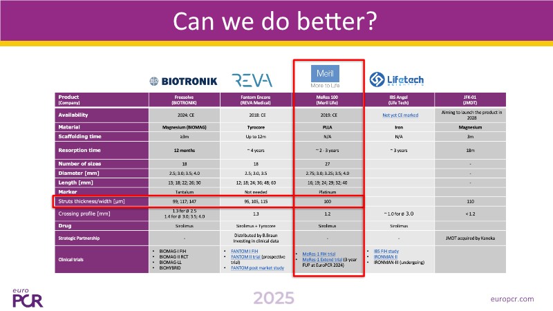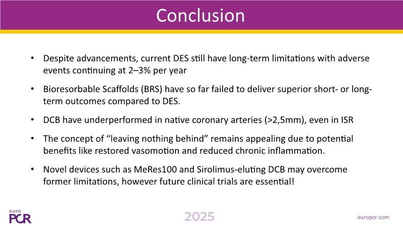 This EuroPCR 2025 session highlights the latest device innovations reshaping interventional cardiology. Learn how the Myval OCTAPRO THV combines predictable deployment with minimal foreshortening for improved outcomes in structural heart procedures. In the coronary space, the session explores the renewed appeal of the “leave nothing behind” philosophy through novel bioresorbable scaffolds and sirolimus-coated balloons. You’ll also hear about practical applications of dedicated bifurcation and tapered stents, and gain insights into the ultra-thin strut Evermine50™ DES platform, now under evaluation in the SORT OUT XII DAPT trial. From device design to clinical practice, explore how these technologies are paving the way for safer, more durable outcomes in complex interventions.