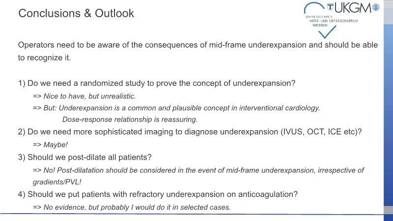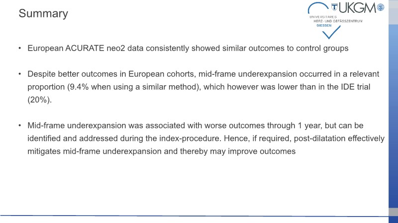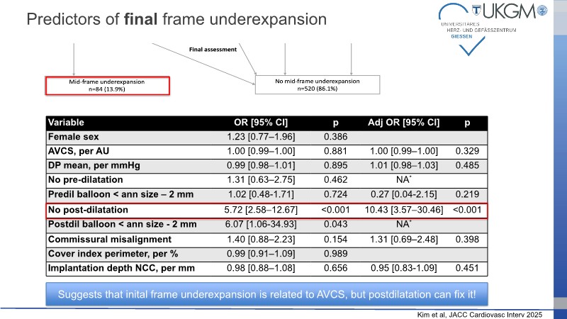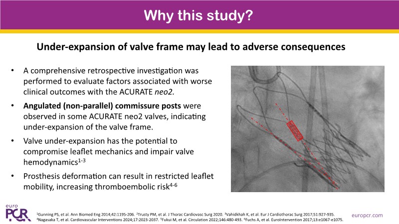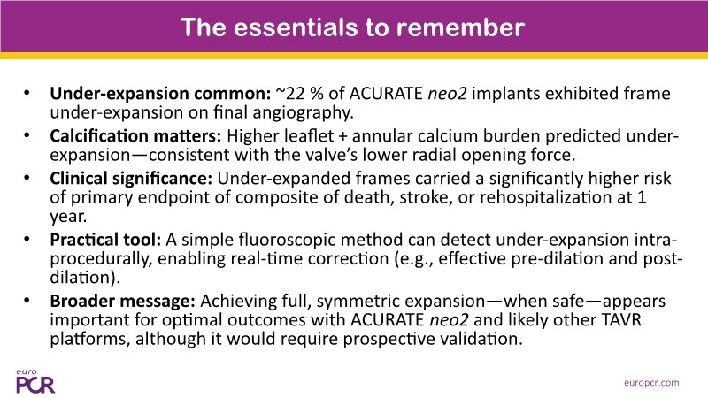 This session addresses recent advancements and ongoing challenges in transcatheter aortic valve implantation (TAVI), with a particular focus on valve selection during index procedures. Presentations include data from the Accurate IDE trial, highlighting the prognostic implications of valve underexpansion. A clinical case involving an 80-year-old patient with severe aortic stenosis and multiple comorbidities illustrates the importance of personalized procedural planning, particularly in terms of vascular access and valve positioning. The session also emphasizes the value of lifetime patient management strategies, including coronary access and the feasibility of redo TAVI, supported by simulation.
