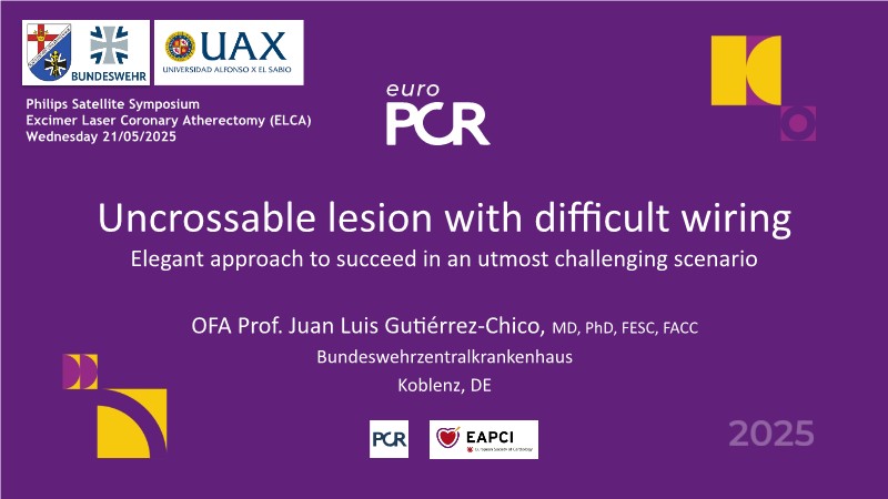 Watch this EuroPCR 2025 session to see how ELCA can make the difference in two challenging cases: a severely calcified, undilatable lesion, and an uncrossable one. Learn how pre- and peri-procedural imaging (CT, IVUS, OCT) supports tailored decision-making, and how ELCA enables safe and effective lesion preparation—through surface cracking and tissue softening—for optimal stent expansion. The second case highlights its value in precision wiring, especially in CTO-CHIP centres. Get practical tips to safely integrate laser into your complex PCI strategy.