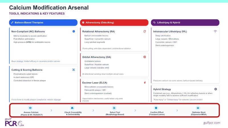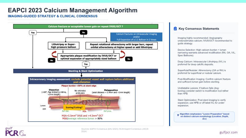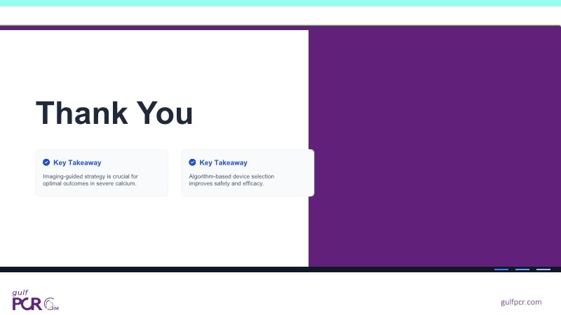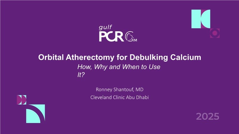 Explore the management of heavily calcified LAD lesions in this PCRGulf-GIM 2025 session. Discover how OCT imaging guides lesion assessment, differentiates superficial from deep calcium, and informs the need for plaque modification. Learn when and how to use orbital atherectomy or intravascular lithotripsy, and follow the step-by-step stent implantation, optimisation, and final evaluation using both angiography and OCT.