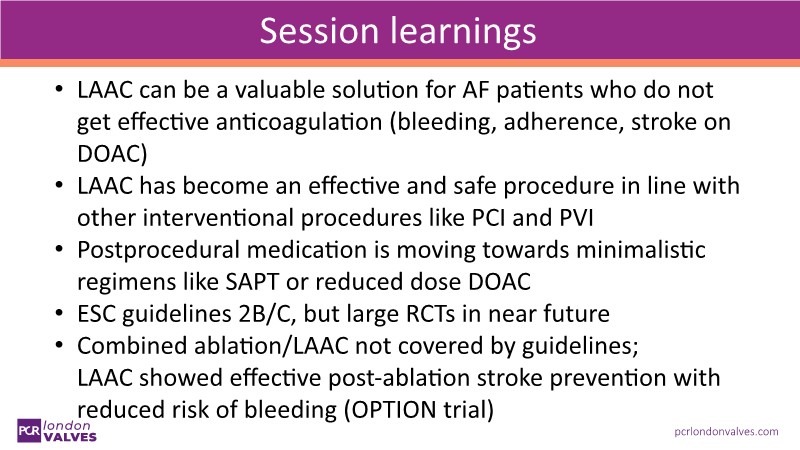 This session addresses the evolving landscape of left atrial appendage (LAA) closure in stroke prevention for atrial fibrillation patients. It reviews unmet clinical needs, evaluates the latest evidence and guideline recommendations, and identifies patient populations that benefit most from LAA closure, with discussions on balancing efficacy and safety and optimizing post-procedural management.