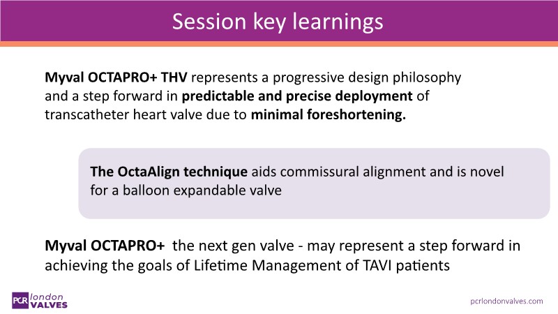 Key presentations cover matching prostheses to patient anatomy, the importance of predictable valve performance in challenging situations, and pivotal trial data supporting Myval THV outcomes. Highlights include the OCTAPRO+ THV’s progressive design enabling precise deployment, the OctaAlign technique for commissural alignment, and next-generation strategies to optimize lifetime TAVI management.