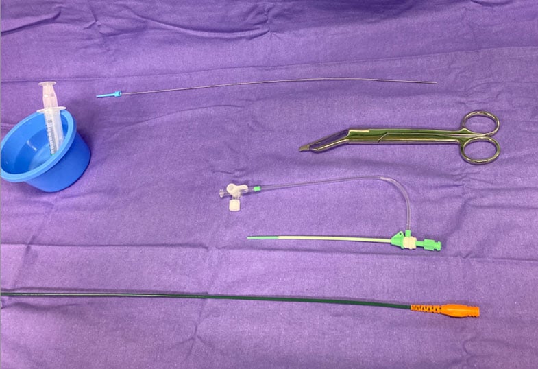 Take the introducer assembled (inner sheath inside the outer sheath tube) of 1 French smaller than the GC, and cut it using the sterile scissors at 2 cm after the proximal segment (4.1) and again 3 cm distally after the first cutting.