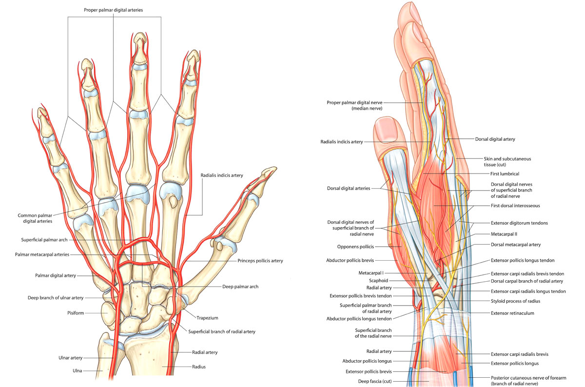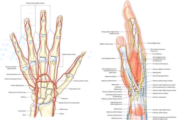 A clear understanding of the arterial vascularisation of the hand is essential to appreciate the physiological advantages of DRA and its role in preserving radial flow. Familiarity with the anatomy of the anatomical snuffbox is equally important for performing a safe, efficient, and well-targeted puncture.