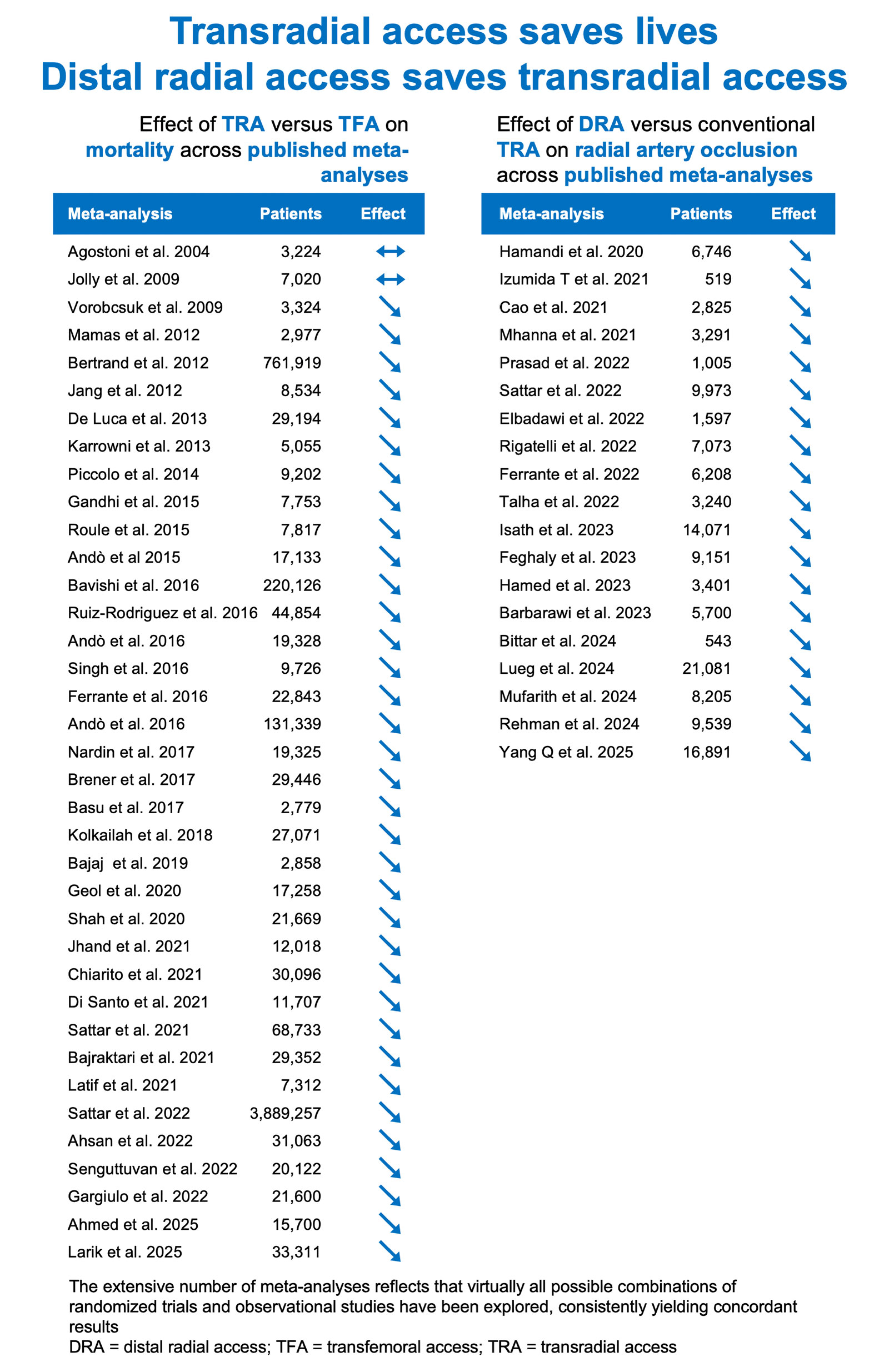 - Key meta-analyses comparing radial with femoral access