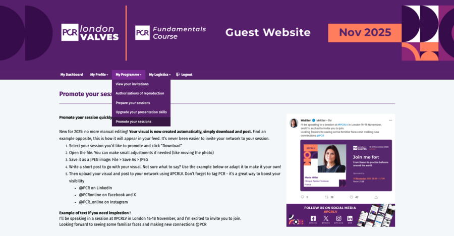 Thanks to the GuestWebsite, your visual and post are ready. In the menu bar click on "My Programme" and then on "Promote my session" where you will find one visual per session ready to be used and one exemple post for inspiration. Follow the 5 easy steps and in just a few minutes you can tell your community all they need to know about your session.