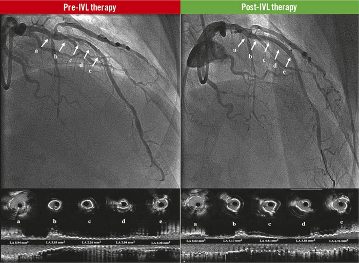 Post-IVL therapy: final result angiograms after coronary lithotripsy therapy of the LAD and the corresponding coronary intravascular ultrasound cross sections (a, b, c, d, e), and longitudinal view of the vessel. The white arrows show significant improvement of stent expansion and lumen obstruction. IVL: intravascular coronary lithotripsy; LAD: left anterior descending coronary artery